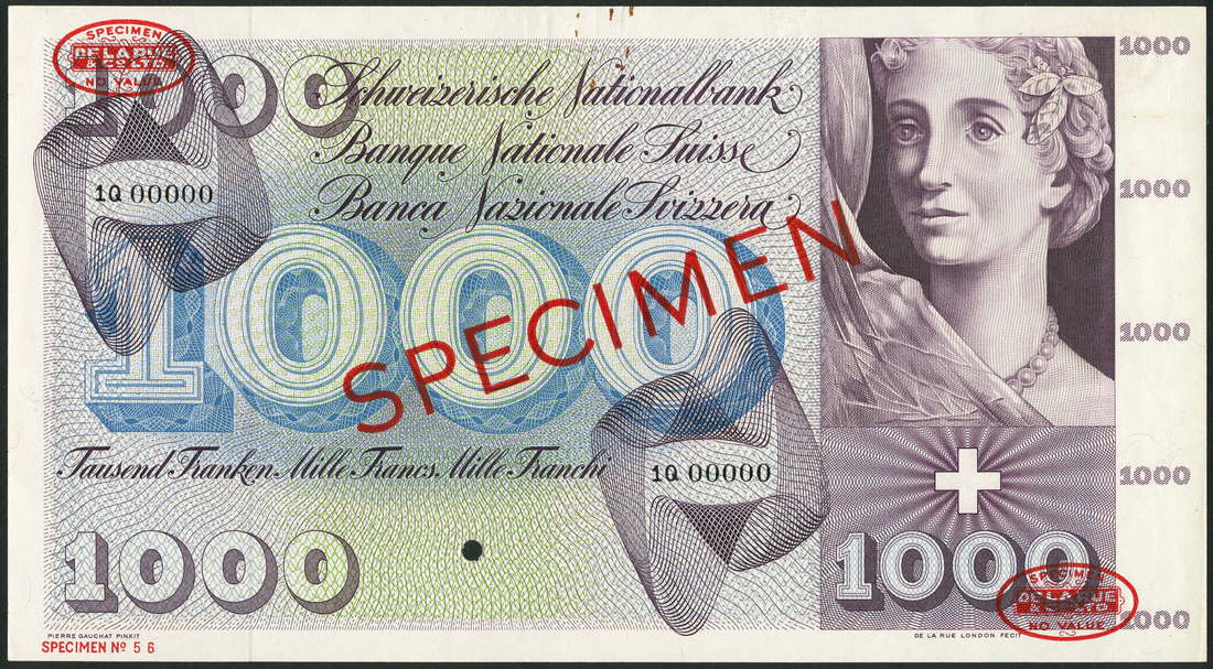 (†) National Bank of Switzerland, specimen 1000 Francs, ND, serial number 1Q 00000, no signatures, violet and turquoise on multicoloured underprint, woman at right, value at centre left, reverse allegorical scene, "Dance Macabre", overprinted SPECIMEN in red with two De La Rue specimen ovals on obverse and reverse