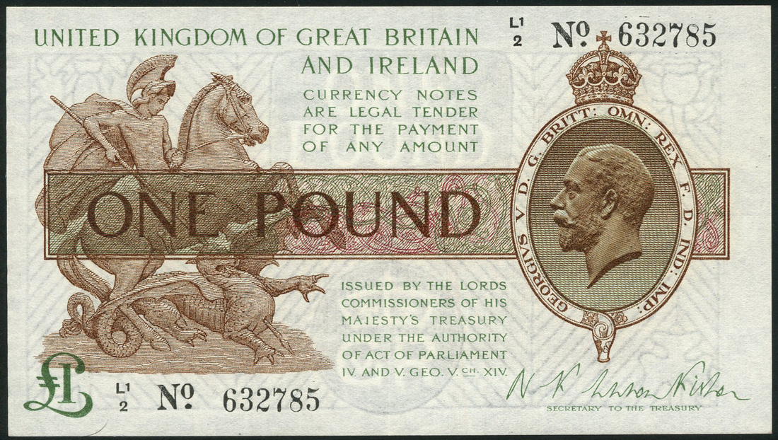 Treasury Series, N F Warren Fisher, £1, ND (26 February 1923), serial number L12 632785, green and brown, portrait King George V at right, St George slaying dragon at left, value low left and in ornate tablet at centre, reverse, brown, Parliament