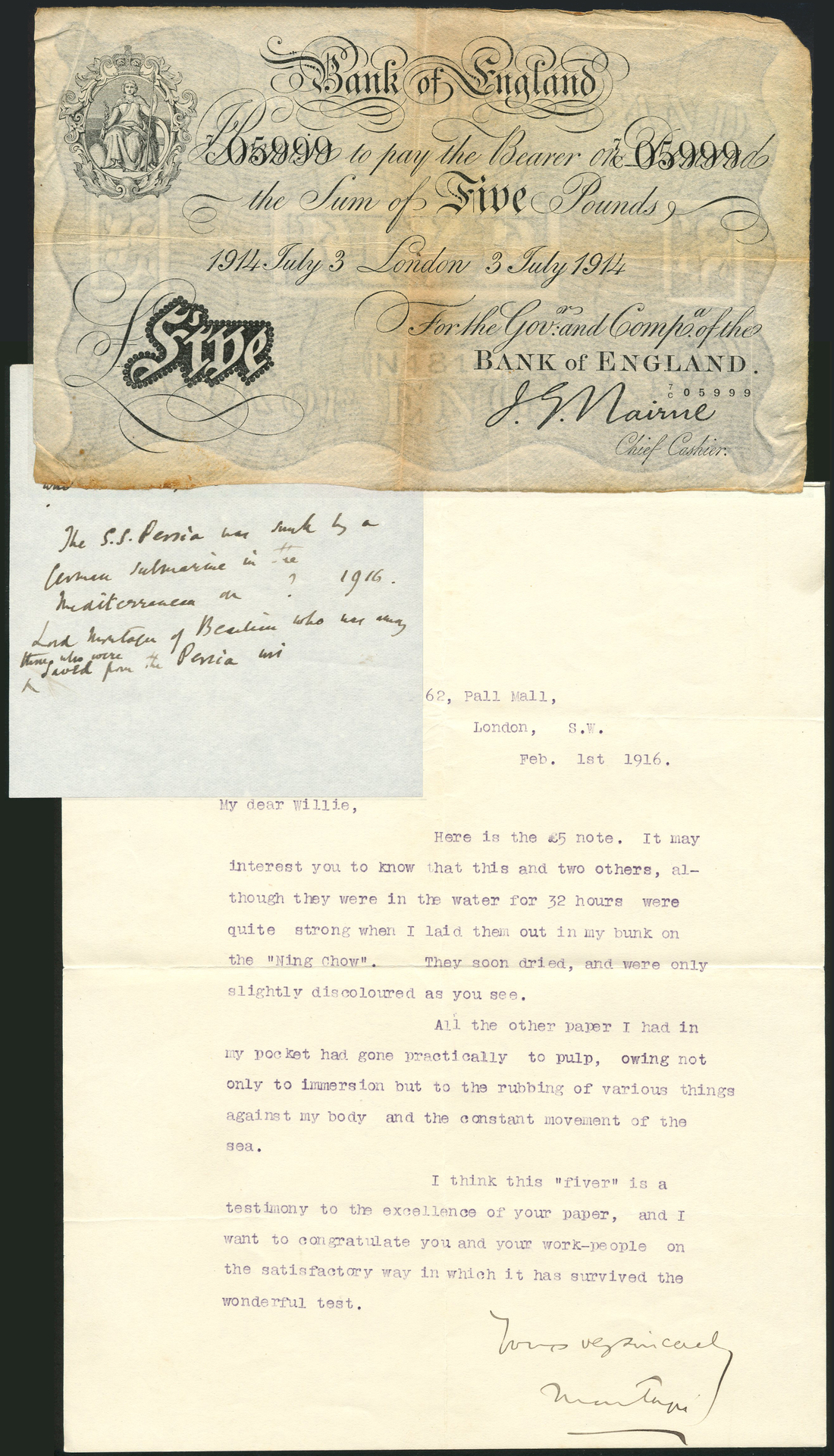 (†) Bank of England, J G Nairne, £5, London, 3 July 1914, serial number 7/C 05999, black and white, crowned vignette of Britannia at top left, value in black tablet at low left, together with a note and a letter detailing how this note was in the pocket of Lord Montagu of Beaulieu when the passenger liner SS Persia was sunk by a German submarine on 30 December 1915. He writes (to Portals, we presume) to congratulate them on the quality of their paper, as the note had been in his pocket for 32 hours while he was in the water, and yet remains remarkably unscathed, in contrast to all other papers on his person, which were destroyed