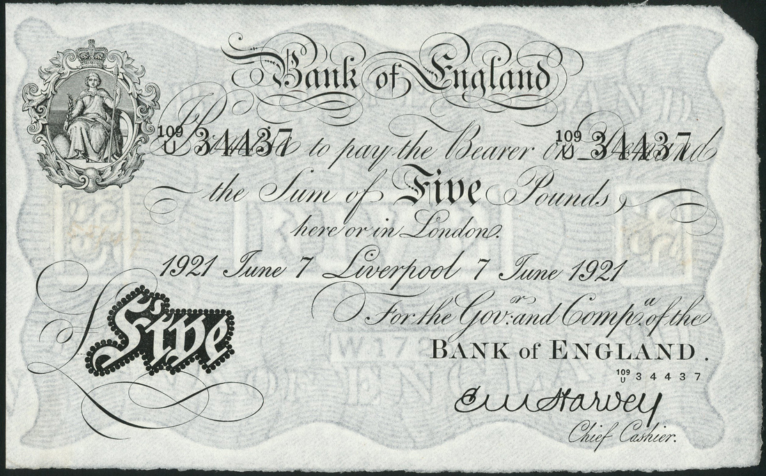 Bank of England, E M Harvey, £5 Liverpool Branch Note, 7 June 1921, serial number 109U 34437 black text on white paper, ornate crowned vignette of Britannia top left, value in black tablet low left
