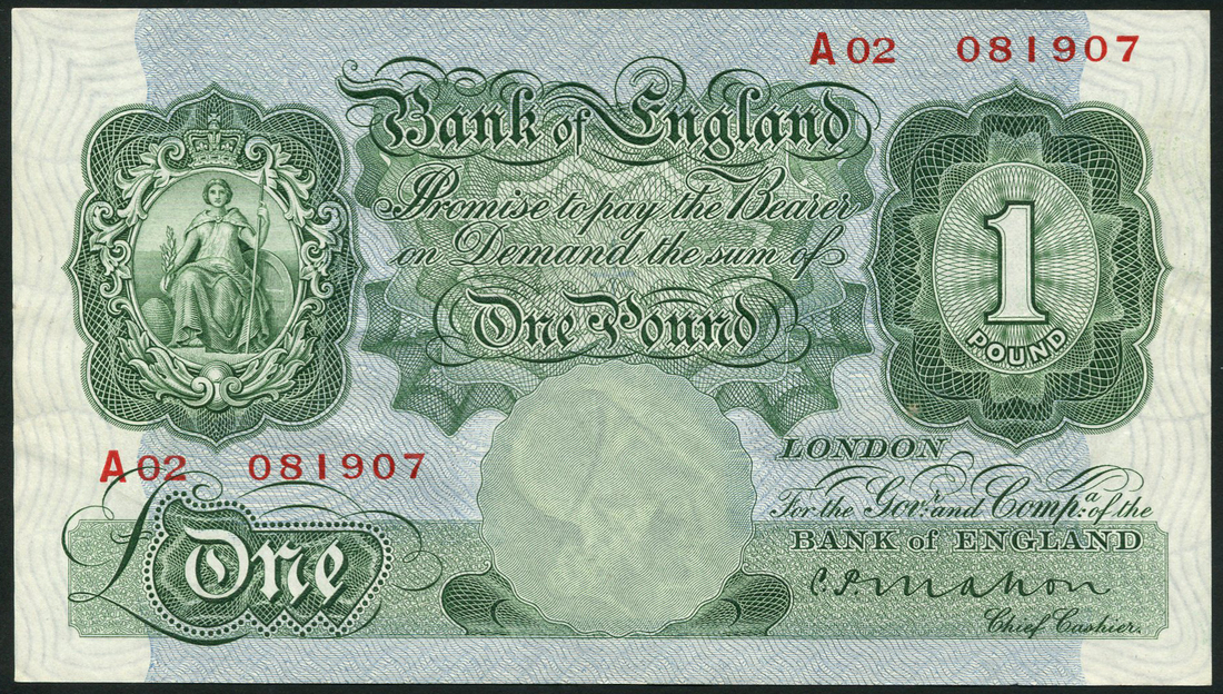 Bank of England, C P Mahon, £1, ND (22 November 1928), serial number A02 081907, green, Britannia in ornate vignette top left, value low left, centre and top right, reverse, blue, pink and green, bank building along top, St George slaying dragon low left and right