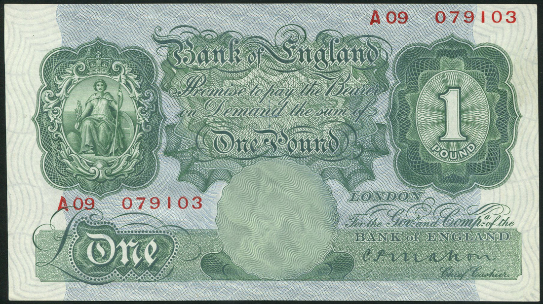 Bank of England, C P Mahon, £1, ND (22 November 1928), serial number A09 079103, green, Britannia in ornate vignette top left, value low left, centre and top right, reverse, blue, pink and green, bank building along top, St George slaying dragon low left and right
