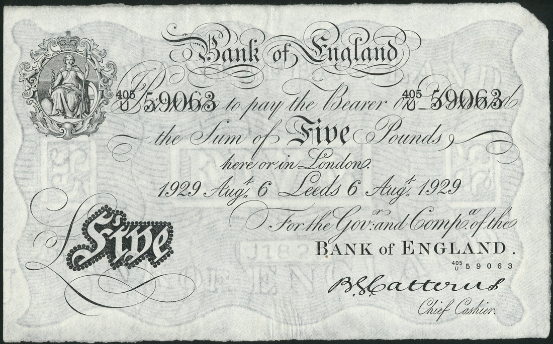 Bank of England, B G Catterns, £5, Leeds, 6 August 1929, serial number 405U 59063, black text on white paper, ornate crowned vignette of Britannia top left, value in black tablet low left