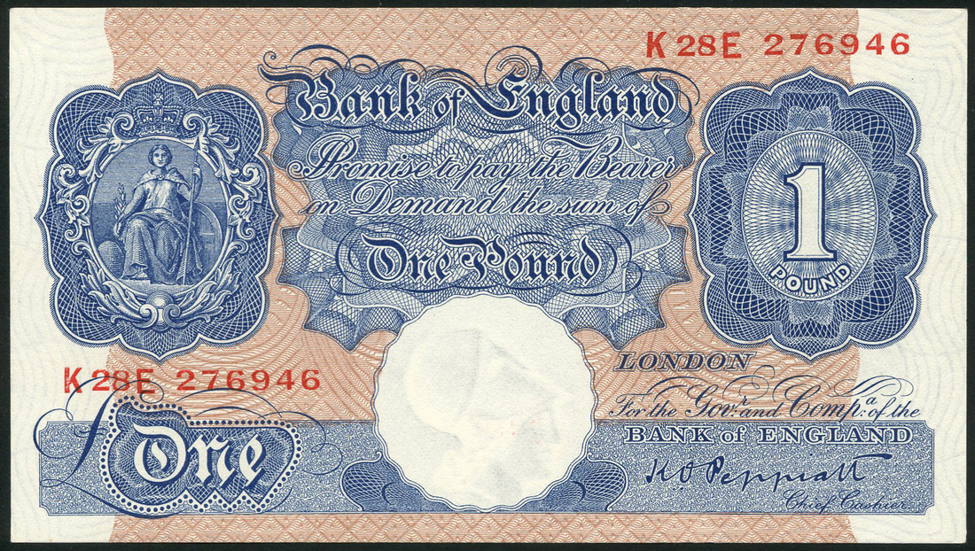 Bank of England, K O Peppiatt, £1 (2), ND (29 March 1940), serial numbers K28E 276946 and H52H 738154, blue and salmon pink, seated Britannia at left, bank title top centre, value in ornate tablets at low left, centre and top right, reverse, blue and brown, bank building along top, St George slaying dragon low left and right