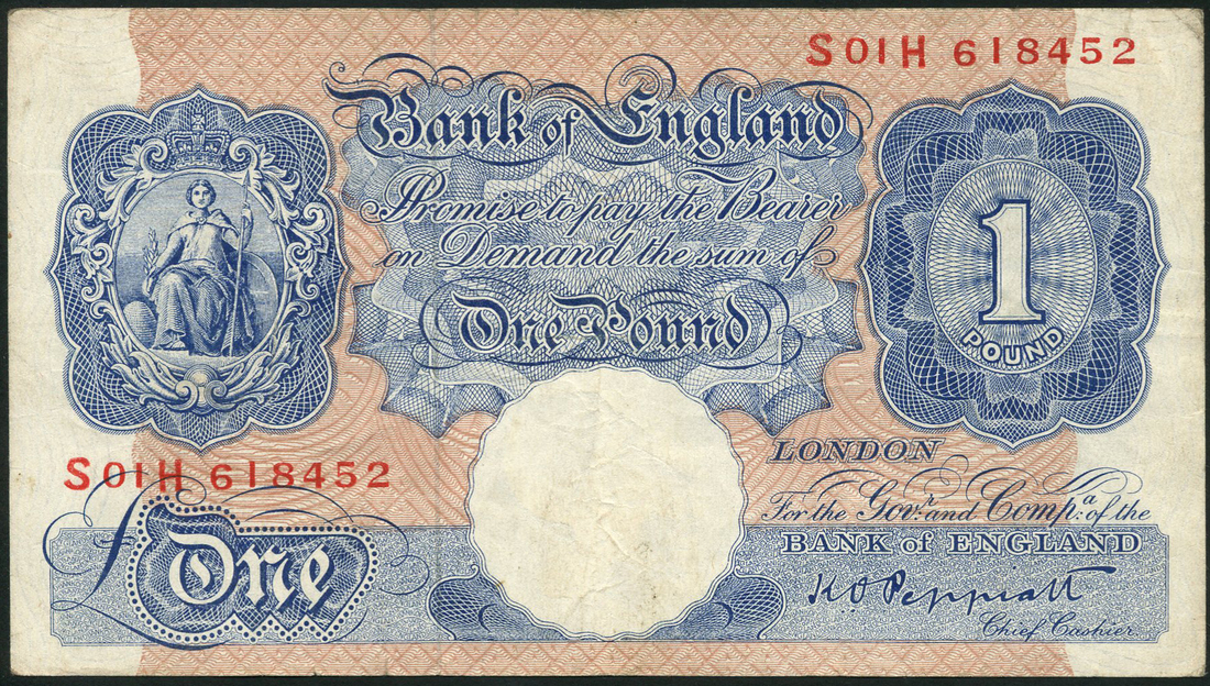 Bank of England, K O Peppiatt, £1, ND (29 March 1940), serial number S01H 618452, blue and salmon pink, seated Britannia in ornate vignette top left, value low left, centre and top right, reverse, brown and light blue, bank building along top, St George slaying dragon low left and right