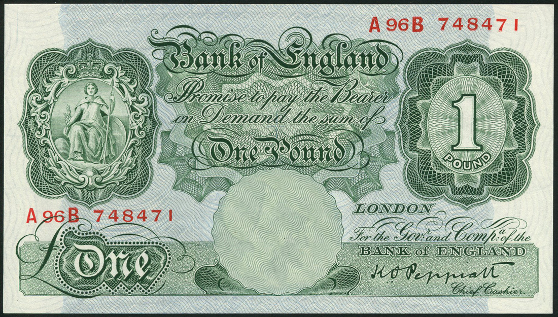 Bank of England, K O Peppiatt, £1 (2), ND (13 September 1948), consecutive serial numbers A96B 748471/2, green, seated Britannia at left, value low left, centre and top left, reverse, pink, blue and agree, bank building top centre, St George slaying dragon low left and right