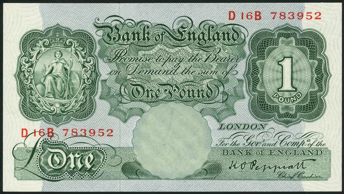 Bank of England, K O Peppiatt, £1 (3), ND (13 September 1948), consecutive serial numbers D16B 783952/4, green, seated Britannia at left, value low left, centre and top right, reverse, blue, pink and green, bank building top centre