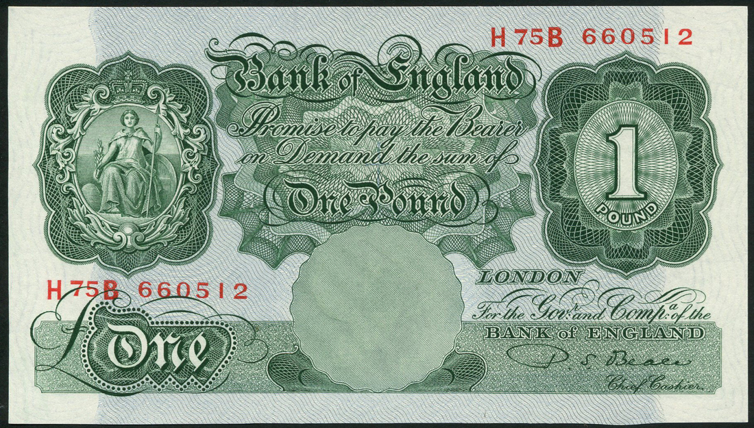 Bank of England, P S Beale, £1 (3), ND (17 March 1950), consecutive serial numbers H75B 660512/4, green, seated Britannia at left, value low left, centre and top right, reverse, blue, green and pink, bank building top centre, St George slaying dragon low left and right