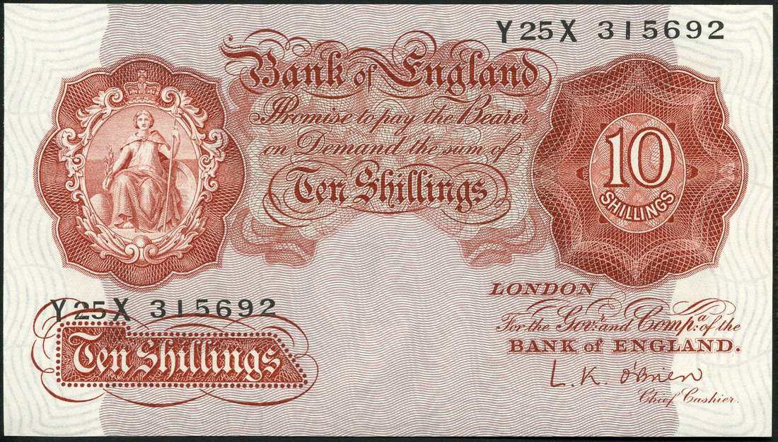 Bank of England, L K O'Brien, 10/- (2), ND (1955), serial numbers Y25X 315691-92, red, Britannia at left, value at top right and in tablet at low left, complete with a letter and envelope with details about the notes