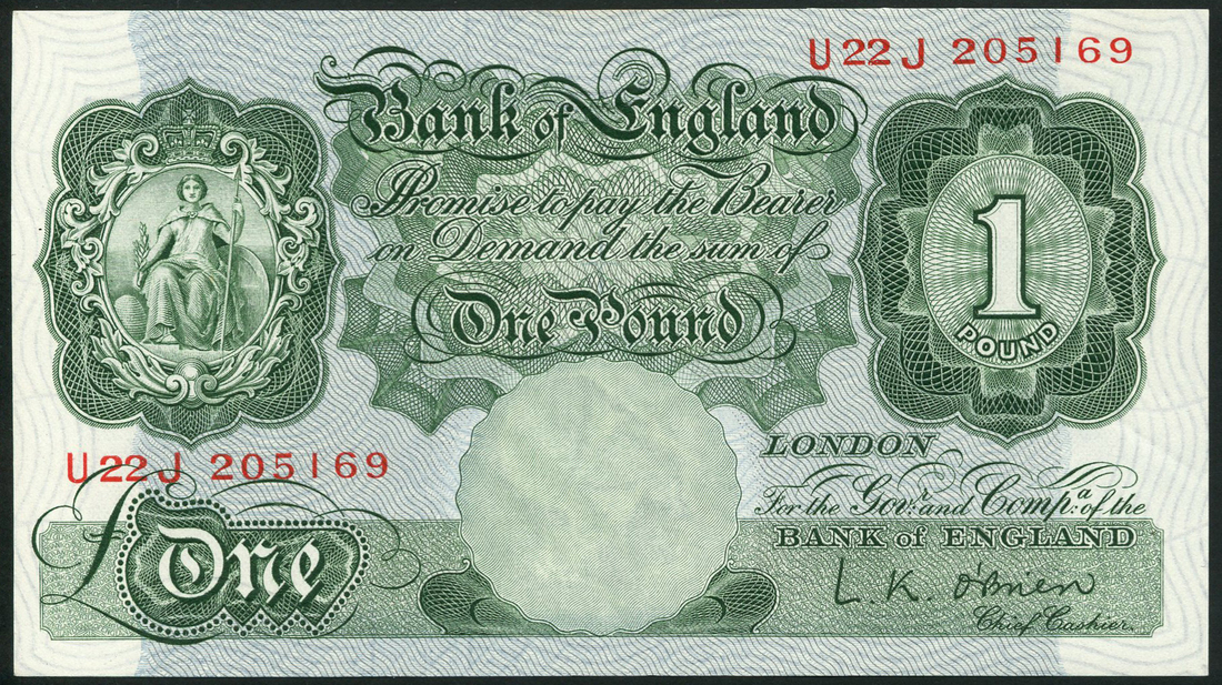 Bank of England, L K O'Brien, £1 (2), ND (21 November 1955), consecutive serial numbers U22J 205169/70, green, seated Britannia at left, bank title top centre, value in ornate tablets low left and top right and at centre, reverse, bank building top centre, St George slaying dragon low left and right