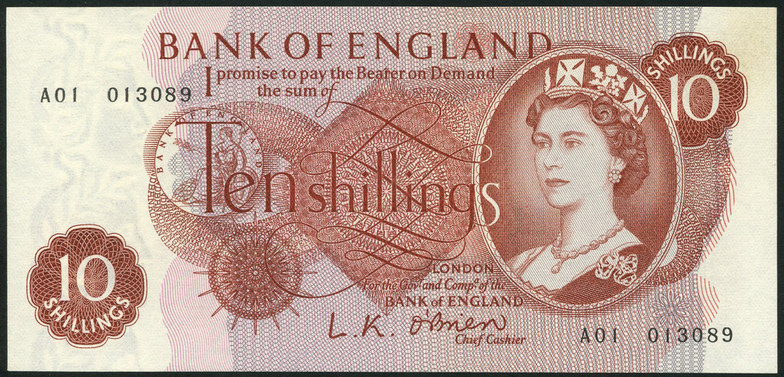 Bank of England, L K O'Brien, 10 shillings, ND (21 October 1961), serial number A01 013089, russet brown, portrait Queen Elizabeth II at right, Britannia centre left, value low left, centre and top right, reverse, Britannia at centre