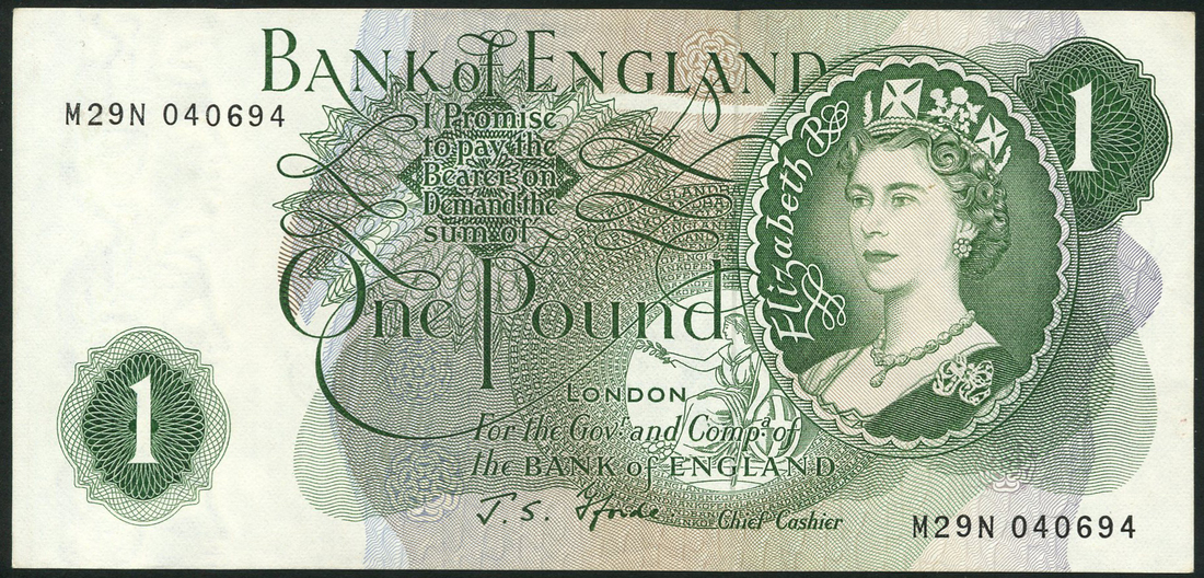 Bank of England, J S Fforde, £1, ND (15 February 1967), serial number M29N 040694, green, portrait Queen Elizabeth II at right, Britannia low centre right, value low left, centre and top right, reverse, Britannia centre right