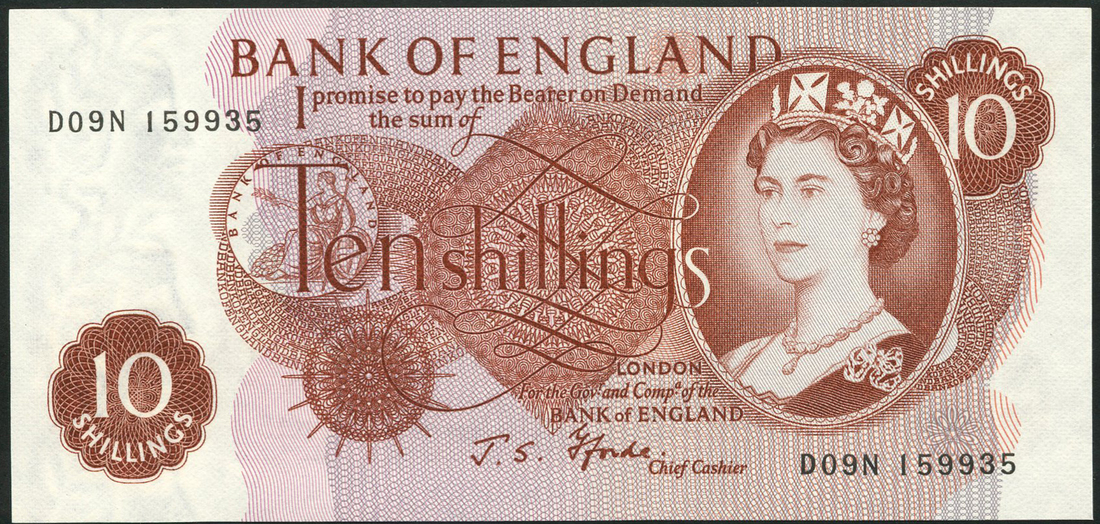 Bank of England, J S Fforde, 10 shillings (4), ND (15 February 1967), consecutive serial numbers D09N 159935/38, russet, portrait Queen Elizabeth II at right, seated Britannia centre left, bank title along top, value low left, centre and top right, reverse, Britannia