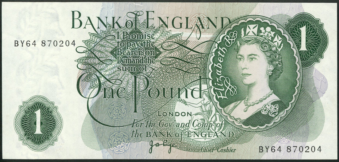 Bank of England, J B Page, £1 (4), ND (1970), consecutive serial numbers BY64 870204/7, green, portrait Queen Elizabeth II at right, seated Britannia below, value low right, centre and top right, reverse, Britannia