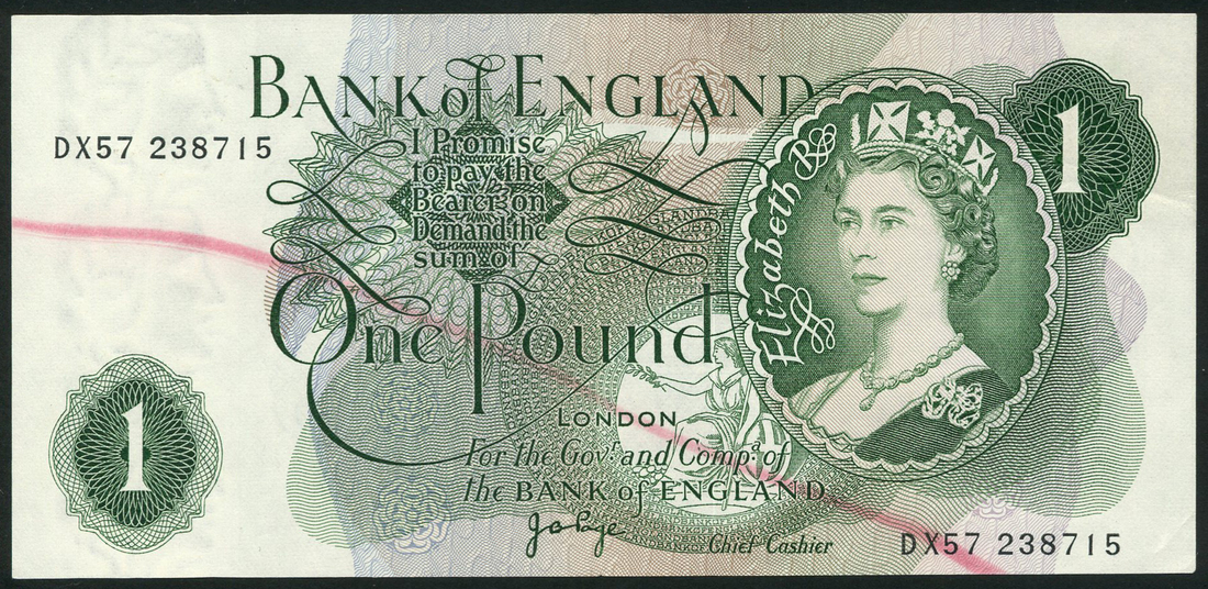 ERROR: Bank of England, J B Page, £1, ND (1970), serial number DX57 238715, green, portrait Queen Elizabeth II at right, value low left, centre and top right, reverse, seated Britannia