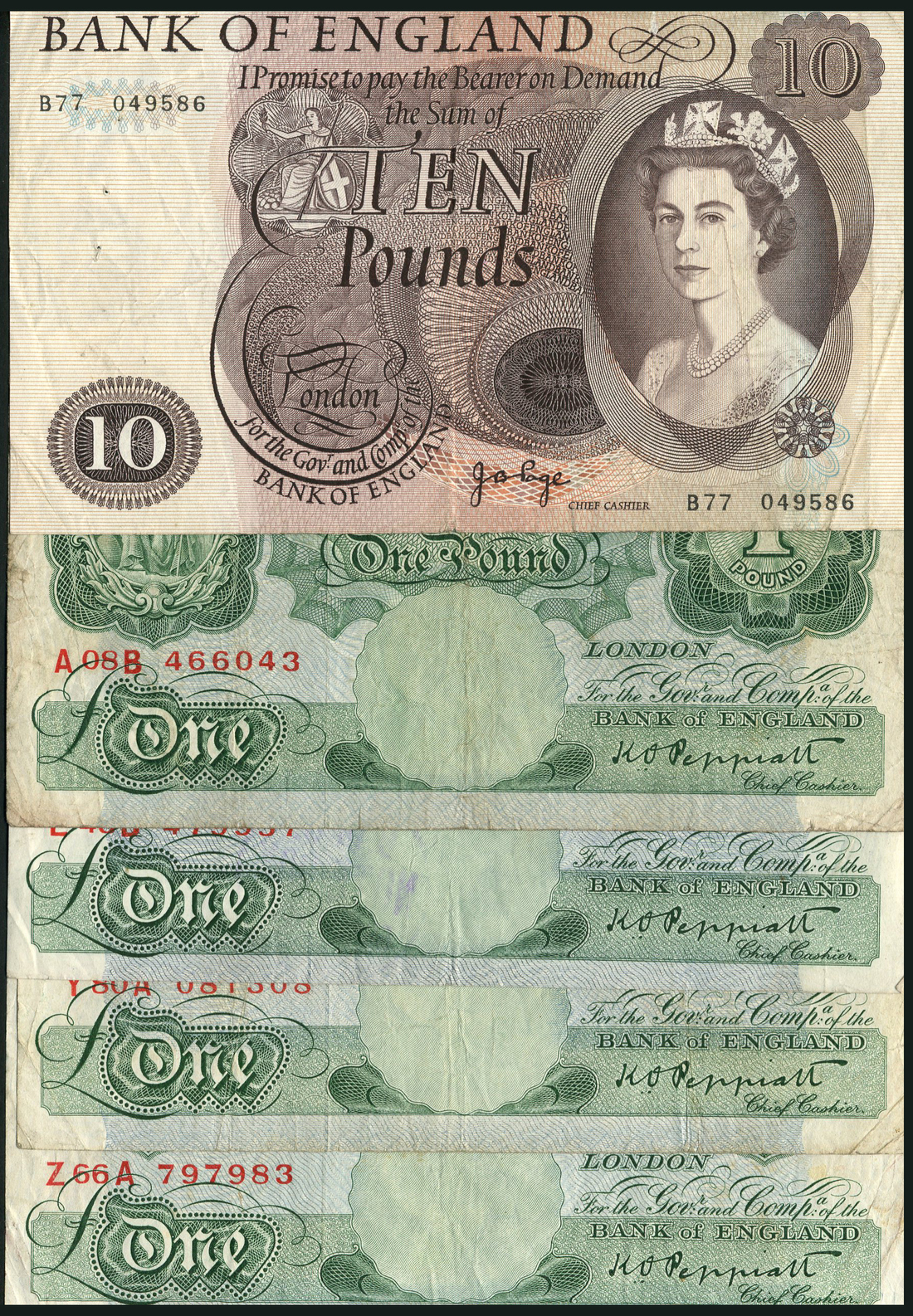 Bank of England, K O Peppiatt/J.B.Page, £1 (4), ND (13 September 1948), green, seated Britannia at left, bank title top centre, value in ornate tablet low left, centre and top right, reverse, bank building top centre, St George and dragon low left and right, also J.B.Page £10, ND (1971), brown on multicolour, portrait Queen Elizabeth II at right, Britannia top centre left, reverse, lion with key
