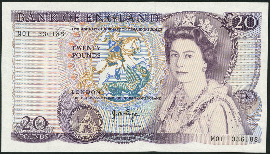 Bank of England, J B Page, £20, ND (1970), serial number M01 336188, purple and multicolour, portrait Queen Elizabeth II at right, St George and dragon at centre, seated Britannia low centre left, reverse, William Shakespeare