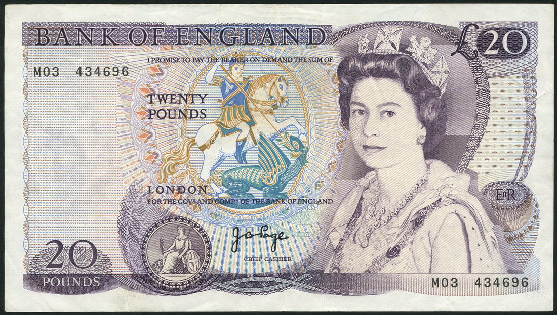Bank of England, J B Page, £20, ND (1970), serial number MO3 434696, purple and multicolour, portrait Queen Elizabeth II at right, St George and dragon at centre, seated Britannia low centre left, reverse, William Shakespeare, also £10, ND (20 February 1975), serial number MO3 005356, brown and orange, portrait Queen Elizabeth II at right, seated Britannia low left, reverse, Florence Nightingale