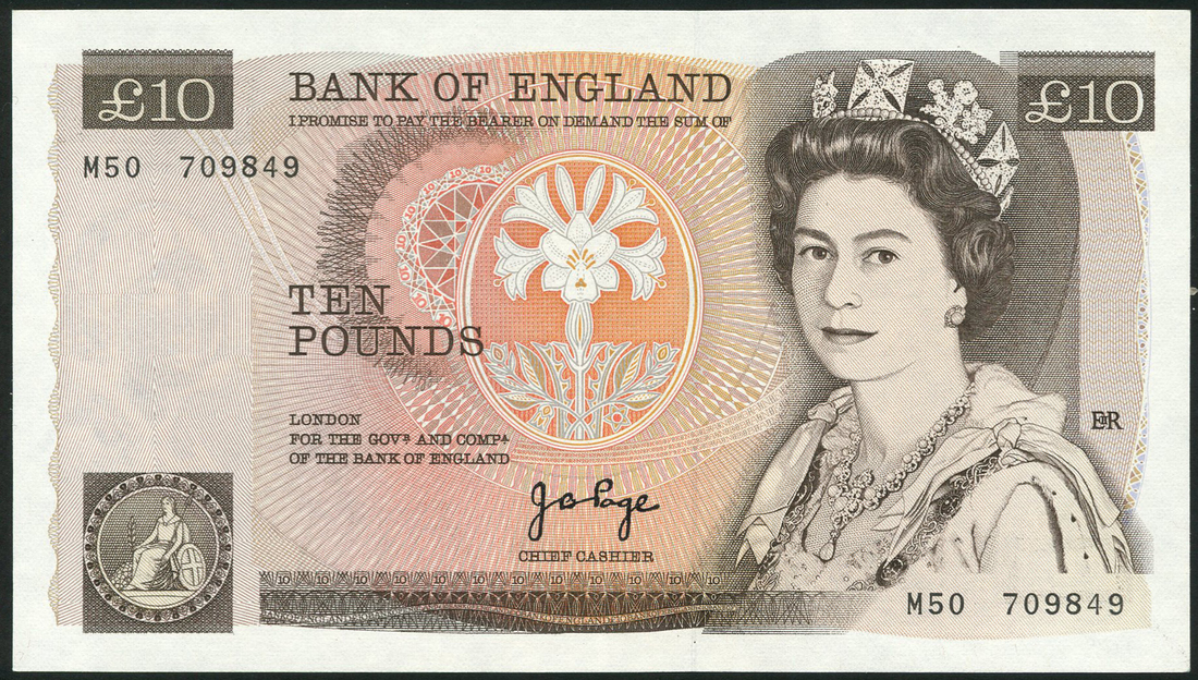 Bank of England, J B Page, £10, ND (20 February 1975), serial number M50 709849, brown and multicolour, portrait of Queen Elizabeth II at right, seated Britannia low left, reverse, Florence Nightingale
