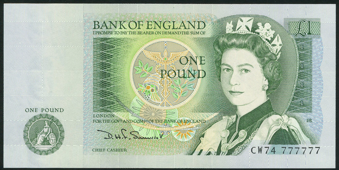Bank of England, J B Page, £5 (2), ND (20 March 1981), serial number 33N 999999, and D H F Somerset, serial number CW74 777777, both green and multicolour, portrait Queen Elizabeth II at right, seated Britannia at low left, reverse, Sir Isaac Newton