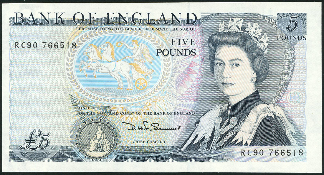Bank of England, D H F Somerset, £5, ND (1980), serial number RC90 766518, blue, portrait Queen Elizabeth II at right, Britannia in chariot top centre left and seated low centre left, reverse, Duke of Wellington