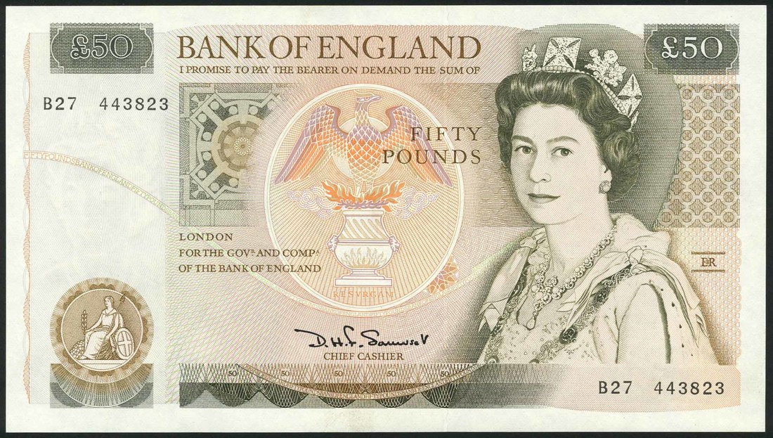 Bank of England, D H F Somerset, £50 (4), ND (1981), serial numbers B27443823-26, brown on multicolour underprint, Elizabeth II at right, phoenix at centre, reverse Wren, view of London and St Pauls