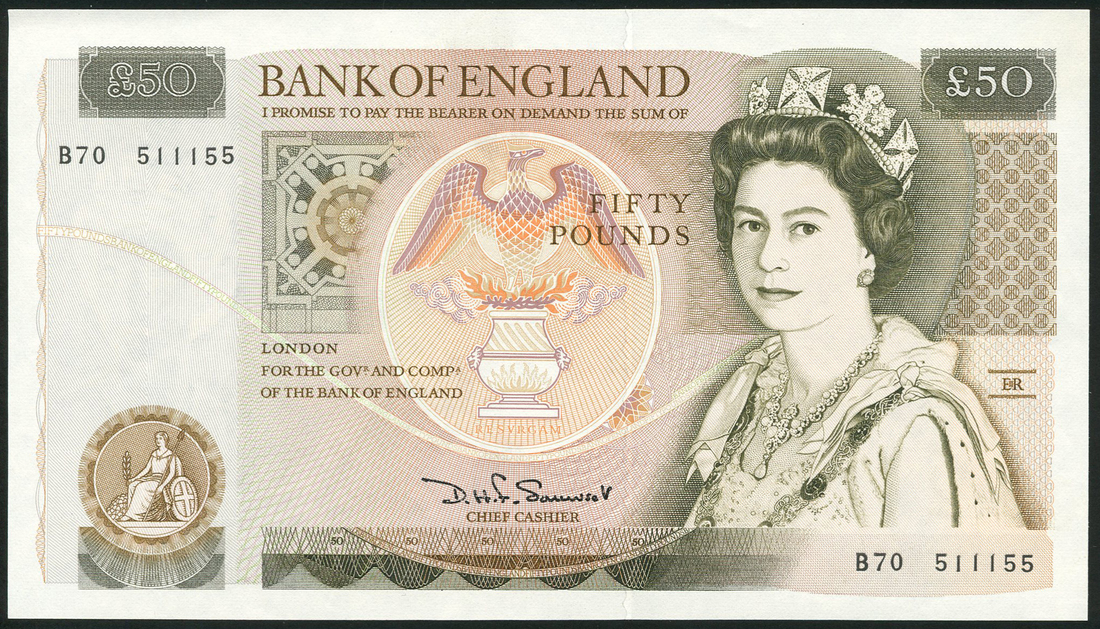 Bank of England, D H F Somerset, £50 (2), ND (1981), serial numbers B70 511155 and 511165, brown on multicolour underprint, Elizabeth II at right, phoenix at centre, reverse Wren, view of London and St Pauls