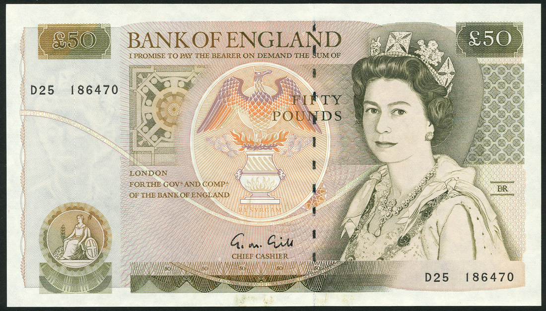 Bank of England, G M Gill, £50, ND (21 July 1988), serial number D25 186470, olive green and multicolour, portrait Queen Elizabeth II at right, seated Britannia low left