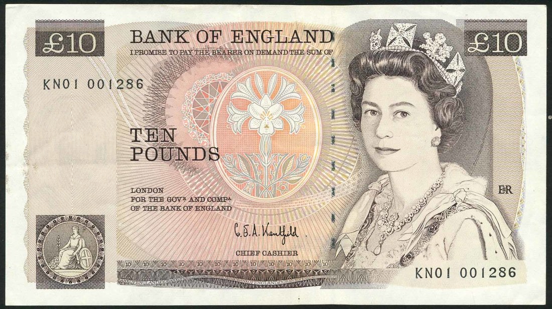 Bank of England, G E A Kentfield, £10, ND (25 November 1991), serial number KN01 001286, brown and multicolour, portrait Queen Elizabeth II at right, seated Britannia low left, reverse, Florence Nightingale, hospital scene