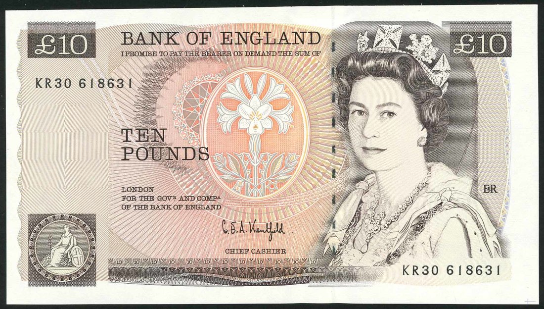 Bank of England, G E A Kentfield, £10, ND (25 November 1991), serial number KR30 618631, brown on multicolour, portrait Queen Elizabeth II at right, seated Britannia low left, reverse, Florence Nightingale