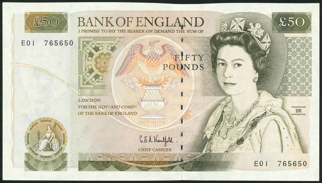 Bank of England, G E A Kentfield, £30, ND (25 November 1991), serial number E01 765650, olive green on multicolour, portrait Queen Elizabeth II at right, phoenix rising from flames at centre, seated Britannia low left, reverse, Sir Christopher Wren