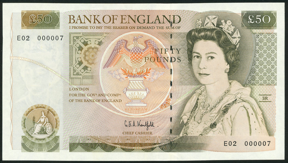 Bank of England, G E A Kentfield, £50, ND (25 November 1991), serial number E02 000007, olive green on multicolour, portrait Queen Elizabeth II at right, phoenix rising from flames at centre, seated Britannia low left, reverse, Sir Christopher Wren