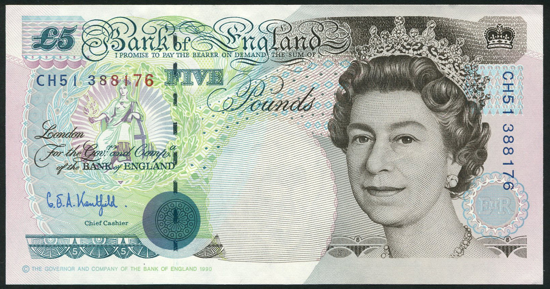 Bank of England, G E A Kentfield, £5 (3), ND (1993), consecutive serial numbers CU51 388174/6, blue and green on multicolour underprint, portrait Queen Elizabeth II at right, Britannia at left, reverse, George Stephenson at right, Stephenson's rocket locomotive at left