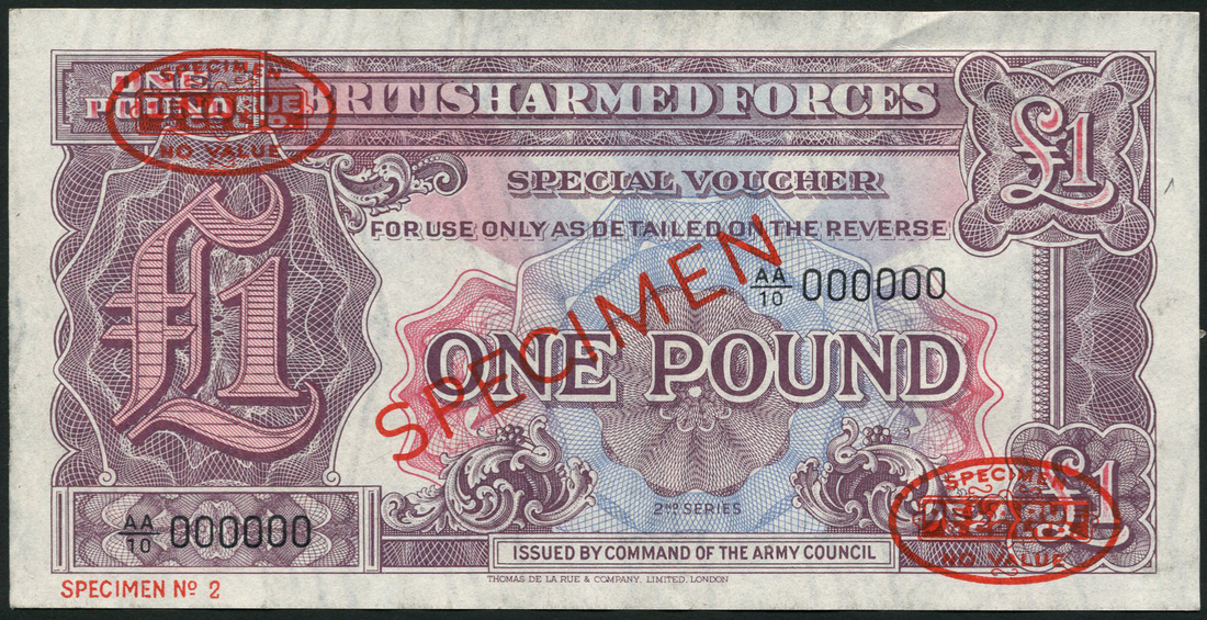 (†) British Armed Forces, a partial specimen set of the second issue comprising 3D,6D, 1/-,2/6,5/- and 10/- and 1 pound, all ND (1961),