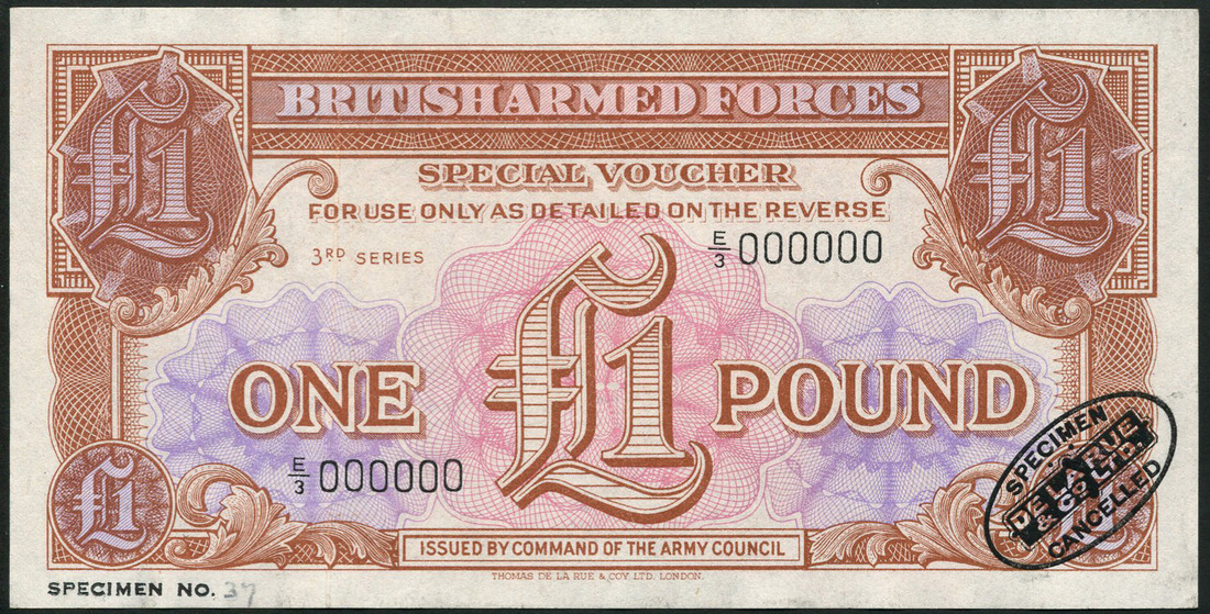 (†) British Armed Forces (for use in the Suez crisis), a specimen set of the third issue comprising 3D,6D, 1/-,2/6,5/- and 10/- and 1 pound, all ND (1956),