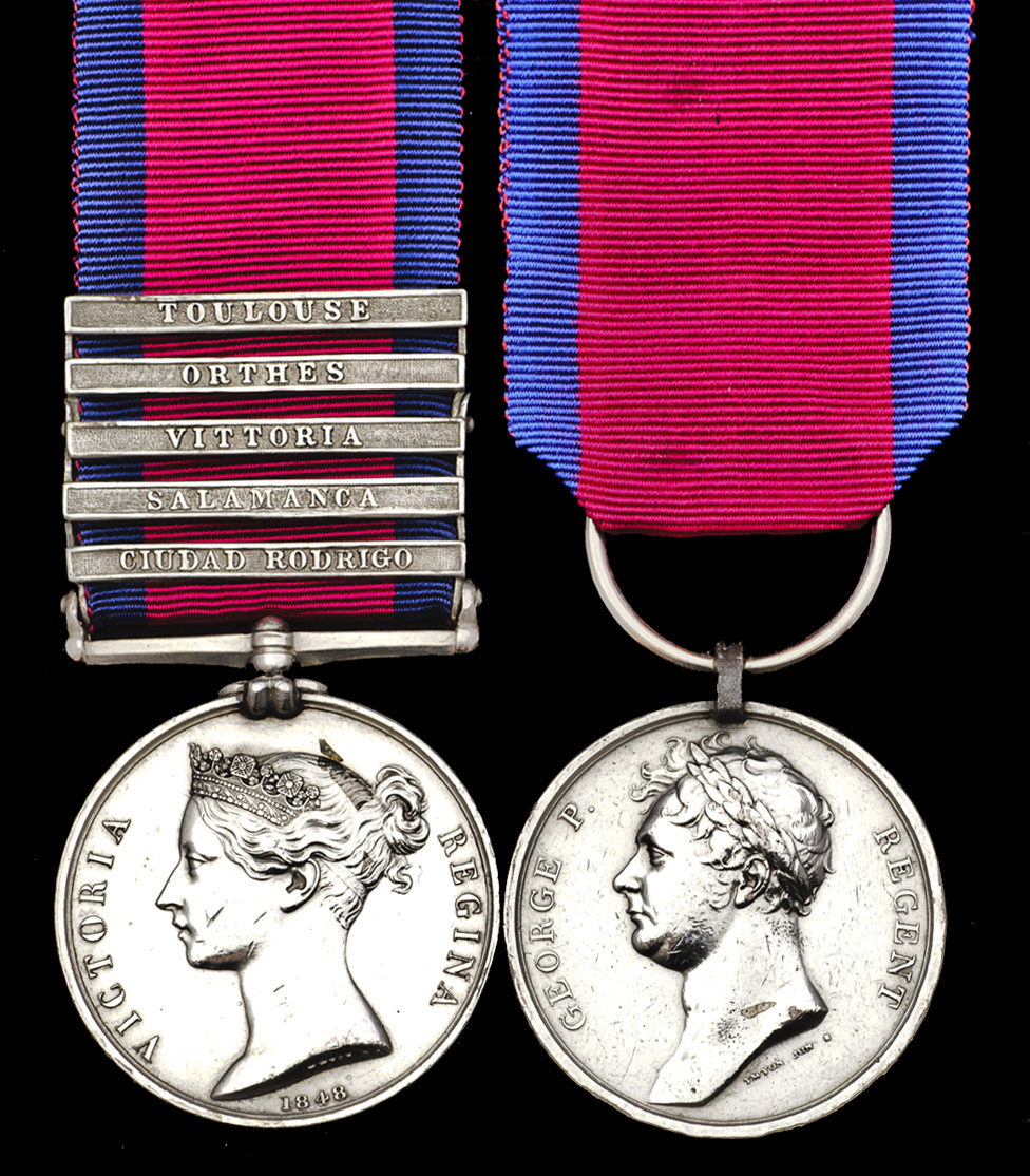 Military General Service 1793-1814, five clasps, Ciudad Rodrigo, Salamanca, Vittoria, Orthes, Toulouse (P. McEwan, Driver, R.H. Arty.); Waterloo 1815 (Peter M'Ewan, Driver, Royal Horse Artillery), with original steel clip and later split ring suspension, minor edge bruising, very fine (2)