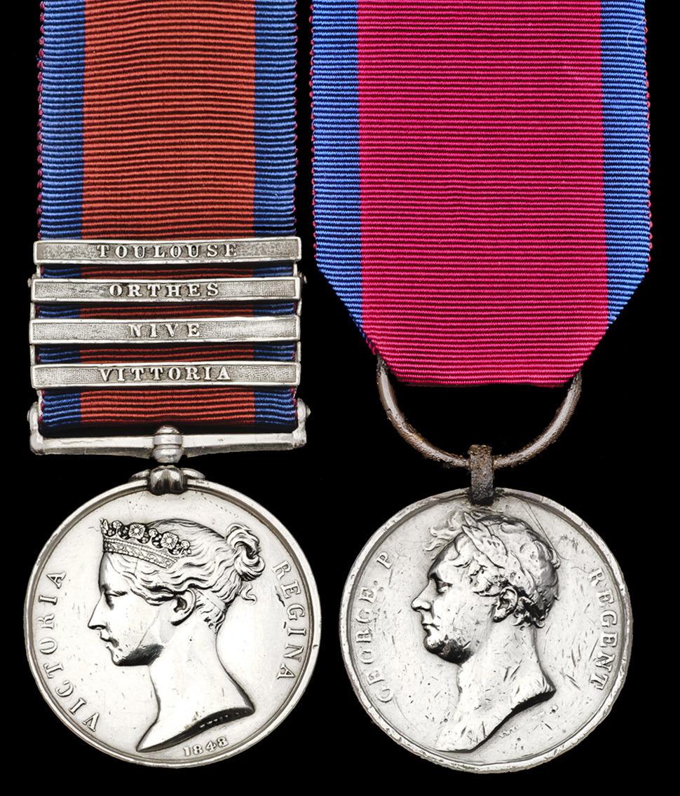 Military General Service 1793-1814, four clasps, Vittoria, Nive, Orthes, Toulouse (R. McReynolds, R. Arty. Drivers.); Waterloo 1815 (Robert ...Reynolds, Royal Artill. Drivers), with original steel clip and split ring suspension, contact marks, good fine or better (2)