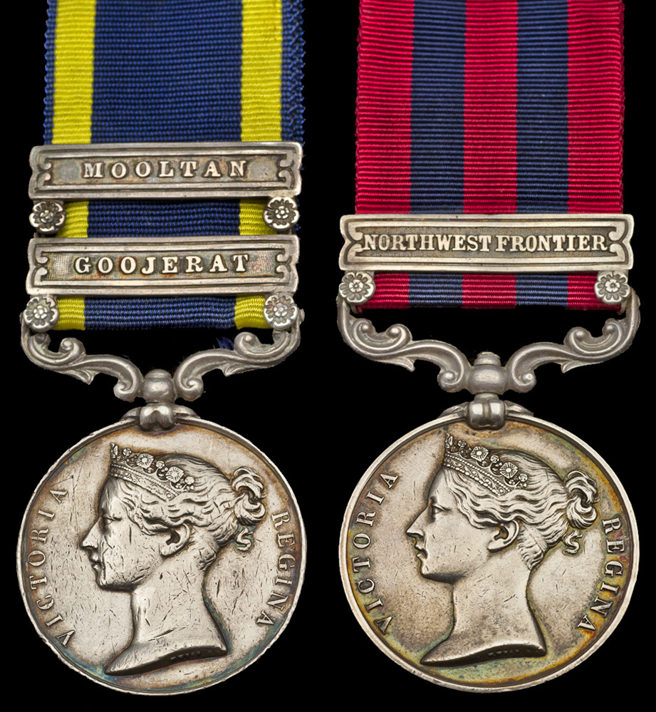 Punjab 1848-49, two clasps, Mooltan, Goojerat (Private John Varney. H.M.'s ... Foot); India General Service 1854-95, one clasp, Northwest Frontier (3142 Corpl. J. Varney H,M 32nd. Regt.), heavy contact marks to first, therefore nearly very fine, the second better (2)