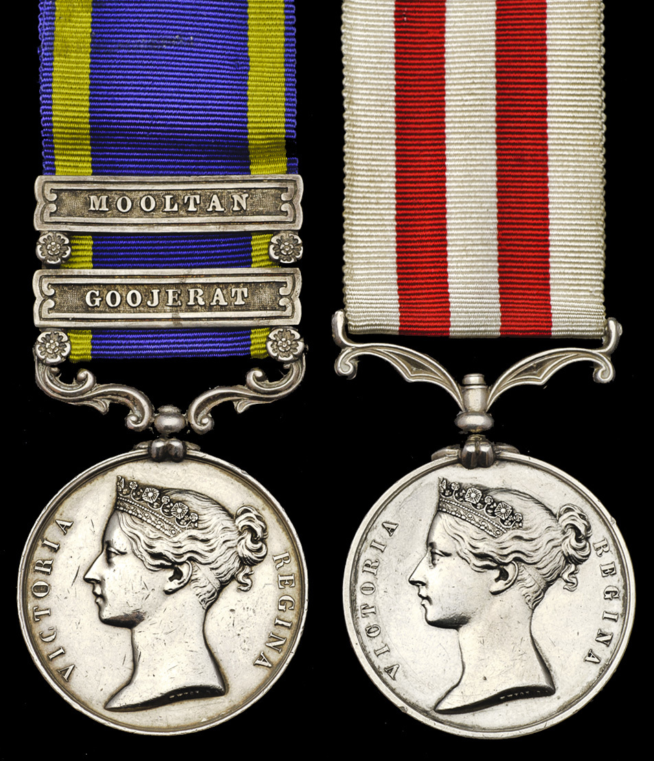 Punjab 1848-49, two clasps, Mooltan, Goojerat (Corpl. Wm. Johnson, 1st. Eur. Fus.); Indian Mutiny 1857-58, no clasp (Wm. Johnson, 1st. Bombay Eurn. Fusrs.), minor edge bruising and light contact marks, very fine (2)