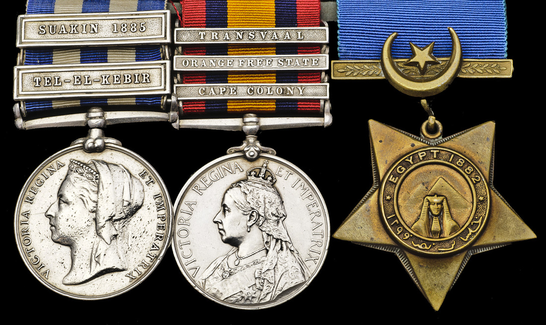 Egypt 1882-89, dated, two clasps, Tel-el-Kebir, Suakin 1885 (2600 Pte. P. Burns. 12th... & T.C.); Queen's South Africa 1899-1902, three clasps, Cape Colony, Orange Free State, Transvaal (2600 S:S:Cr:Mr: P. Burns, A.S.C.); Khedive's Star 1882, unnamed as issued, pitting to first from Star, nearly very fine, the QSA good very fine (3)