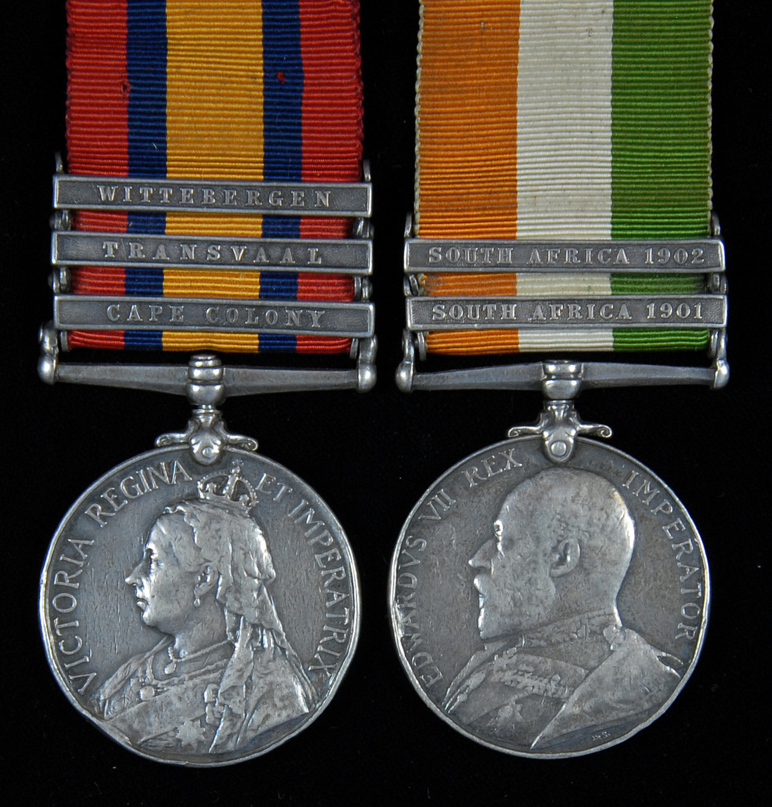 Queen's South Africa 1899-1902, three clasps, Cape Colony, Transvaal, Wittebergen (5528 Pte. W. Quinn. Manchester Regt.); King's South Africa 1901-02, two clasps (5528 Pte. W. Quinn. Manch: Regt.), heavy edge bruising and contact marks, therefore fine