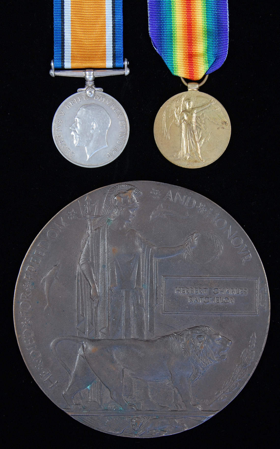 British War and Victory Medals (25736 Pte. H. Batchelor. Lan. Fus.), good very fine, with the recipient's Great War Bronze Memorial Plaque (Herbert Charles Batchelor) in card envelope of issue (2)