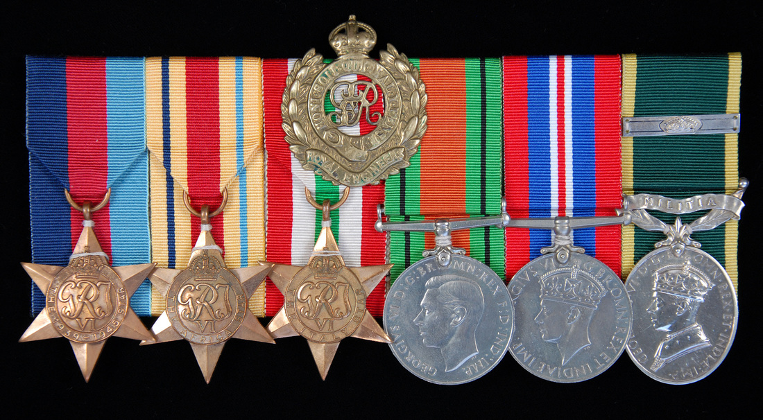 1939-1945 Star; Africa Star; Italy Star; Defence and War Medals; Efficiency Medal, G.VI.R., with 'Militia' scroll suspension, and Second Award Bar (3522111 Spr. R. Boyce. R.E.), good very fine, mounted court-style for display purposes, together with the recipient's cap badge, the reverse stamped 'Boyce 3522111'; the recipient's Soldier's Service and Pay Book; Discharge Certificate; Driving Licence; and various photographs (6)