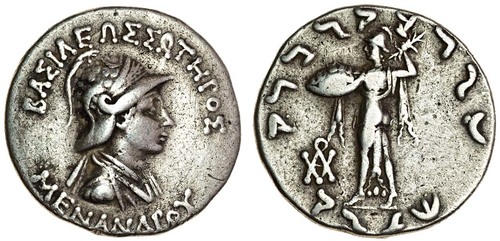 (x) Kingdom of Bactria, Menander I (c.155-130 BC), AR Tetradrachm, 9.55g, diademed and draped bust right wearing crested helmet, BAIE THPO MENANPOY, rev. Athena Alkidemos standing left, holding shield and hurling thunderbolt, monogram before, Kharosthi legend (BN, Series 15,D; SNG ANS - ), very fine
