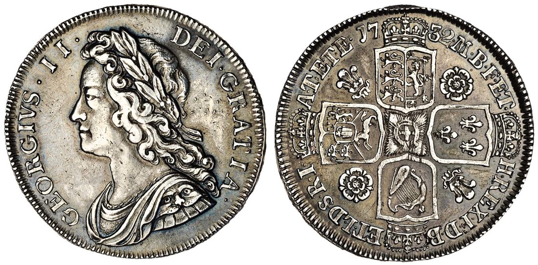 George II (1727-60), Halfcrown, 1732 sexto, laureate draped and cuirassed bust left, rev. four crowned shields cruciform, roses and plumes in angles (ESC 596; S.3692), cleaned, toned, mark on edge at 12 o'clock on reverse, very fine