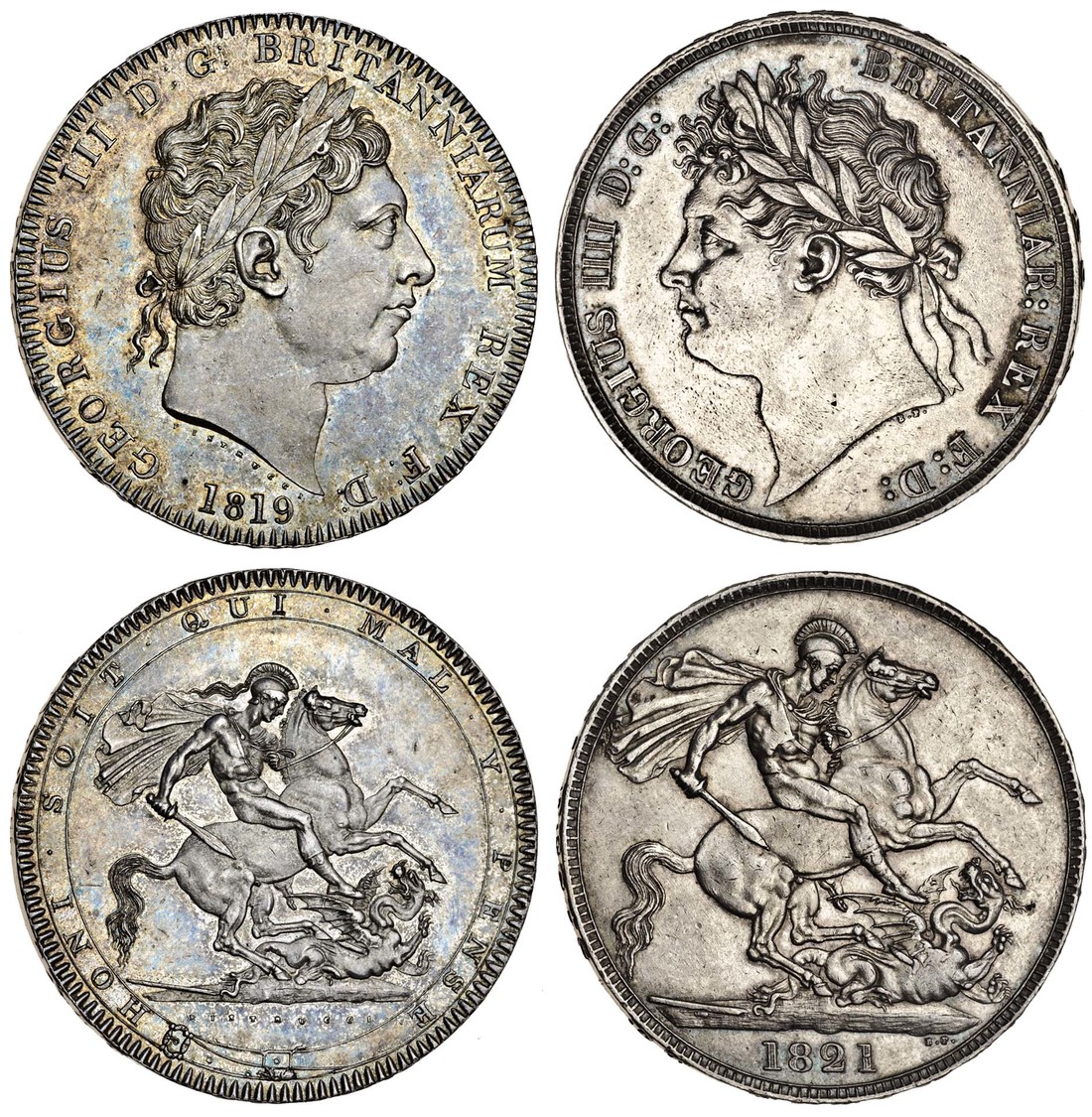 George III, (1760-1820), Crown, 1819 lix, laureate head right, rev. St George and dragon (ESC 215; S.3787), about extremely fine, George IV, Crown, 1821 secundo (ESC 246; S.3805), very fine (2)