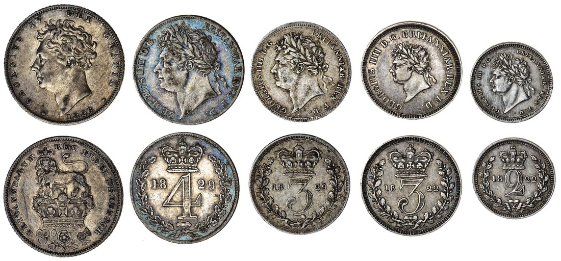 George IV (1820-30), Sixpence, 1826, Fourpence, 1829, Threepences (2), 1822, 1829, Twopence, 1822, very fine (5)