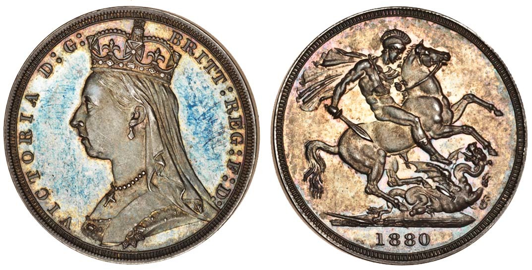 (x) Victoria (1837-1901), pattern Sovereign, in silver, 1880, 4.65g, 21.85mm, crowned and veiled bust left, rev. St George and dragon, date below, no b.p., edge, plain, 1.6mm, medal alignment (cf KM. PnB118), toned, much lustre, scratch on cheek, marks in fields before head, about uncirculated