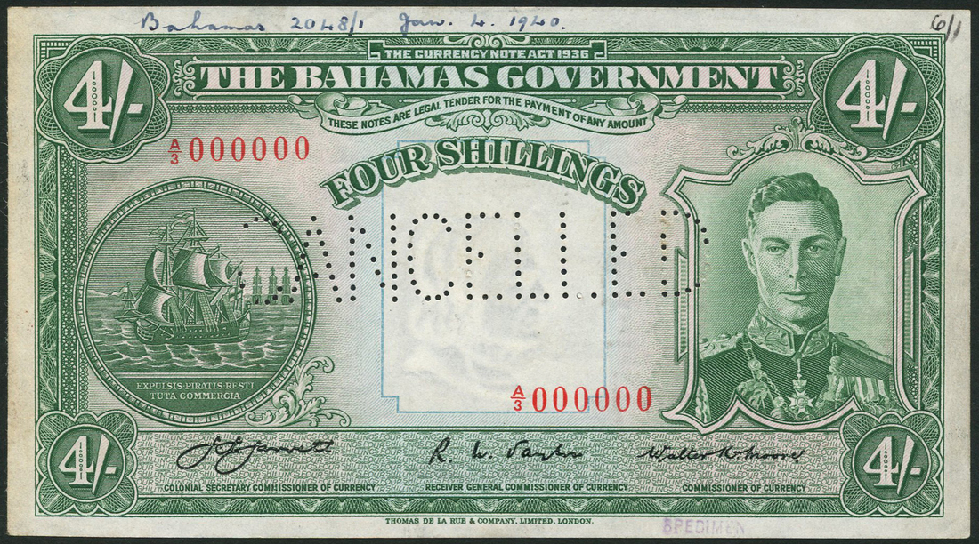 (x) Bahamas Government, specimen 4 shillings (2), ND (1936), red serial numbers A/3 000000 and A/4 000000, green and pale pink, George VI at right, ship seal at left, Jarrett, Taylor and Moore signatures, reverse multicoloured, arms at left, value at right