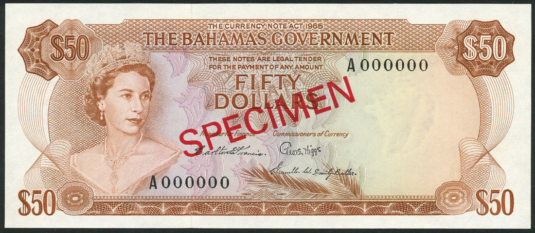 (x) Bahamas Government, specimen $50, ND (1965), serial number A 000000, brown and red and pale blue and pink, Elizabeth II at left, Francis and Higgs and Smiley-Butler signatures, red SPECIMEN overprint,